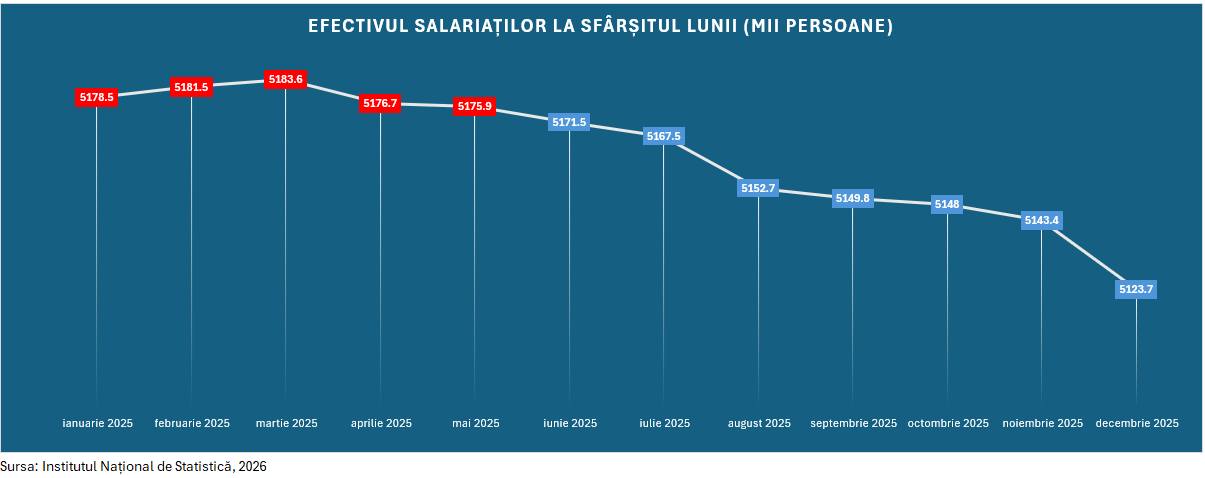 Conform statisticilor oficiale citate de economist, în perioada mai 2025 – decembrie 2025 efectivul salariaților din România a scăzut cu 52.200 de persoane. În urma acestei evoluții, numărul total al angajaților a coborât la cel mai redus nivel din ultimii doi ani.
