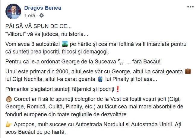 „«Viitorul» vă va judeca, nu istoria… Vom avea 3 autostrăzi pe hârtie și cea mai ieftină va fi intârziata pentru că sunteți prea ipocriți, fricoși și demagogi”, a mai scris senatorul Benea. „Corect ar fi să le spuneți colegilor de la Vest că foștii voștri șefi (Gigi, George, Romică, Culiță, Pinalty, etc.) au făcut cea mai mare absorbție de fonduri europene din toate regiunile de dezvoltare. Apropos, mult succes cu Autostrada Nordului și Autostrada Unirii. Ați scos Bacăul de pe hartă”.