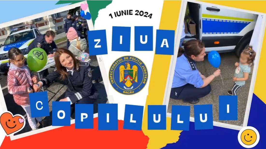 De Ziua Copilului, Inspectoratul de Poliție Județean Bacău invită toți copiii în zona centrală a municipiului Bacău, în parcul din fața Primăriei municipiului Moinești, în Parcul Măgura din Stațiunea Târgu Ocna și piațeta din apropierea Casei de Cultură din municipiul Onești, la evenimente pline de culoare, distracție și emoții frumoase!