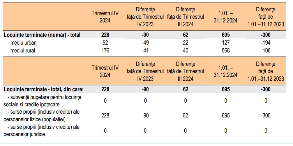 Scăderea a fost mai accentuată în mediul urban, unde numărul locuințelor finalizate a fost de doar 127, cu 194 mai puține față de 2023. În mediul rural, unde construcțiile realizate de populație sunt mai frecvente, au fost date în folosință 568 de locuințe, o scădere mai moderată de 106 unități față de anul anterior.