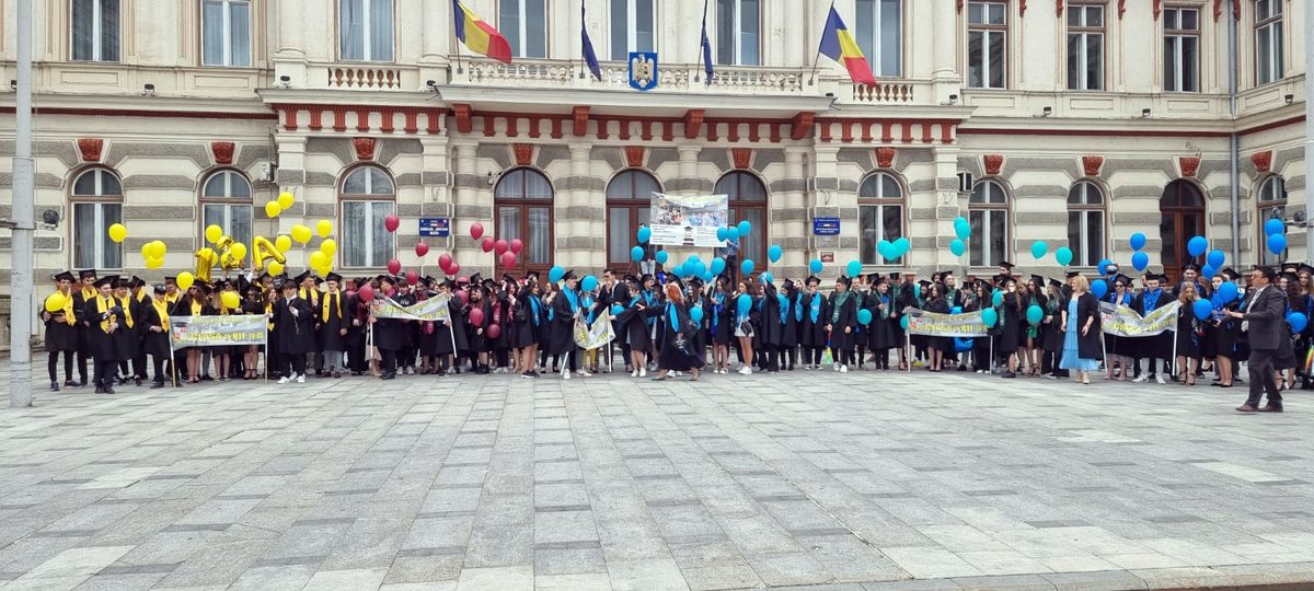 Însoțiți de cadrele didactice, părinți și apropiați, cei 140 de absolvenți ai promoției 2022 de la „Eminescu” au defilat pe traseul str. Oituz – Statuia lui Ștefan cel Mare – Palatul Administrativ – Primărie – Aleea Parcului – Teatrul de Vară „Radu Beligan”.