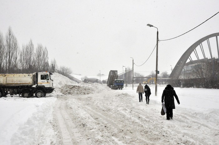 Una dintre aceste zone este cea din spatele stadionului municipal, mai exact între stadion si Bazinul Olimpic, unde camioanele vin unul dupa altul, descarca si pleaca. In urma lor, un buldoexcavator aranjeaza zapada, zi si noapte, in continuu.