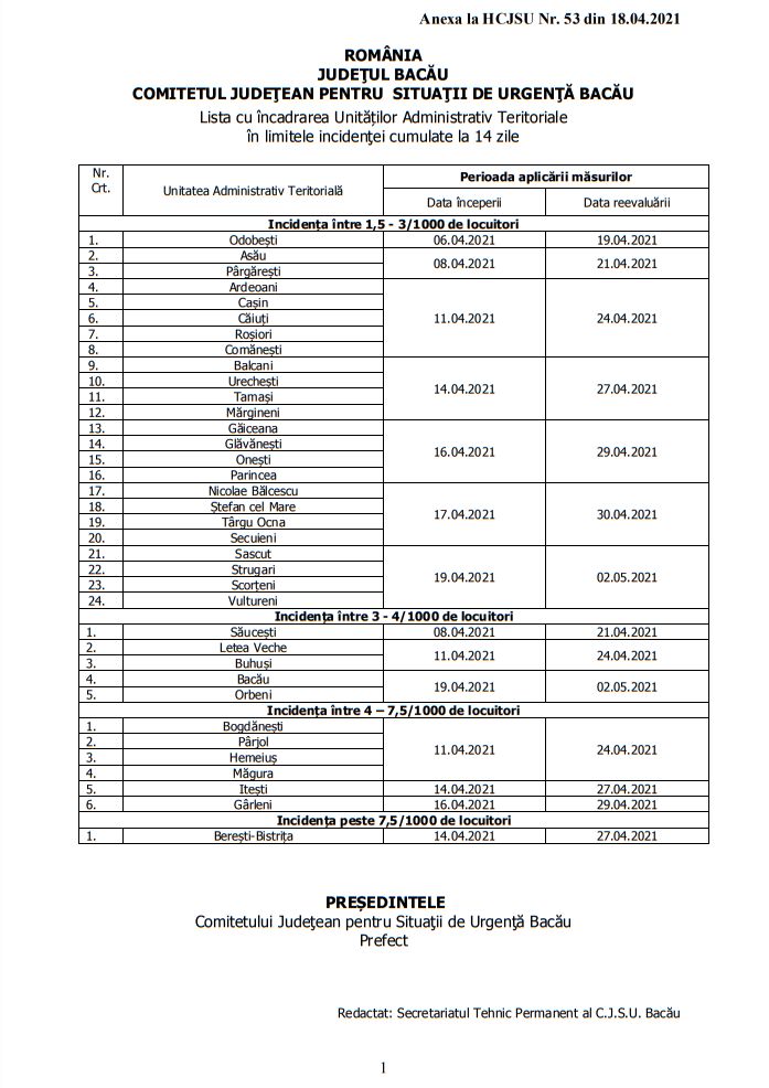 „În acest sens, precizăm că potrivit Anexei la HCJSU 53/18.04.2021 următoarea reevaluare pentru municipiul Bacău va avea loc pe data de 02.05.2021. Până la acea dată, se aplică măsurile prevăzute de HG 432/08.04.2021, cu alte cuvinte, activitățile in interiorul restaurantelor sau evenimentele cu public, în interior, sunt suspendate pentru următoarele 14 zile, până la reevaluare”, se arată într-un comunicat al Prefecturii.