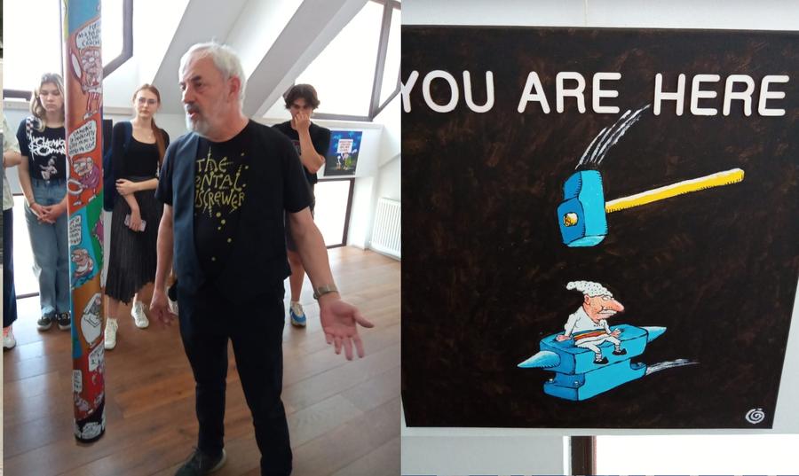 Sunt pe simeză, lucrări inedite, expuse în premieră, realizate în timpul pandemiei, a izolării la domiciliu, dar și recente, cu tema războiului din Ucraina, evident, caricaturi de salon, pentru uzul vizitatorilor, care pot veni la KARO, până la sfârșitul lunii iunie. Chiar merită să faceți un efort, poate constitui o terapie în grup sau individuală, o terapie prin râs. Temele? „Orice, nu-mi plac indicațiile și interdicțiile, fă asta, fă cealaltă, în caricatură, mai ales, nu trebuie să fie limite, opreliști, totul poatre și trebuie atacat, mai ales în România, pentru că totul merge prost!”, a mai spus Ion Barbu, în dialogul cu publicul, printre care un grup de elevi de la Colegiul Național de Artă „George Apostu”, care s-au dovedit cunoscători ai genului.