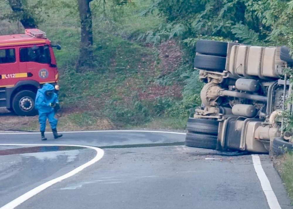 Din primele verificări a reieșit faptul că, un bărbat de 44 de ani, în timp ce conducea o autocisternă ce transporta substanțe chimice ar fi pierdut controlul direcției de deplasare într-o curbă și s-a răsturnat în afara părții carosabile.