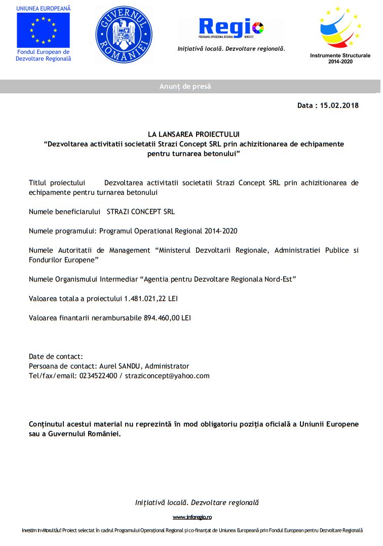 Acasă Comunicat de presă Dezvoltarea activității societății Străzi Concept SRL prin achiziționarea de echipamente pentru turnarea...
