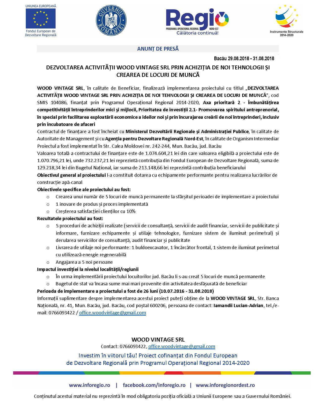 Comunicat de presăDezvoltarea activității Wood Vintage SRL prin achiziția de noi tehnologii și crearea de locuri de muncăde Deșteptarea - 29 august 2018AcțiuneFacebookTwitterWhatsAppTelegramVK