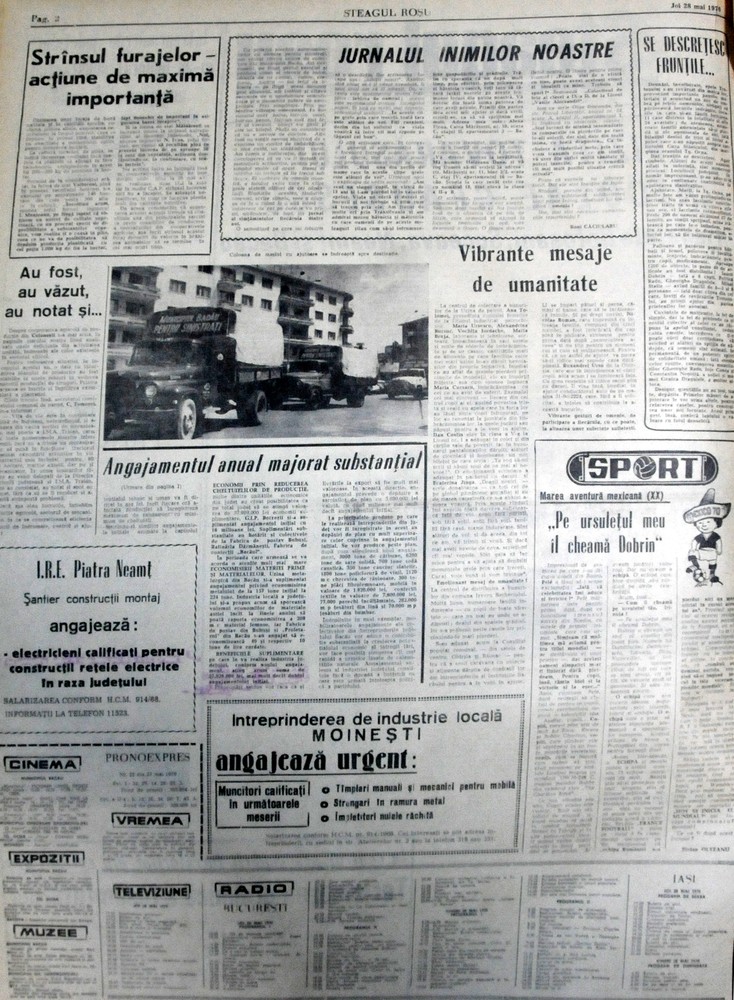 Se auzeau cu ecou comenzile: Alinierea! Drepți! Culcat! Târâș înainte! Drepți! Salt înainte…! Eu mă întrebam de ce spun toți că vin rușii peste noi. Doar în filmele văzute la Căminul Cultural, rușii se luptau și îi băteau pe nemți! Bine că n-au mai venit. Anul 1968 a fost și anul reformelor. Până atunci România era impărțită, din punct de vedere teritorial-administrativ, în 16 regiuni. Regiunea Bacău cuprindea aproape o treime din teritoriul Moldovei. Programele de dezvoltare economică intensivă, eșalonate pe cincinale, impuneau un alt gen de control și coordonare politică. Așa au apărut… județele.