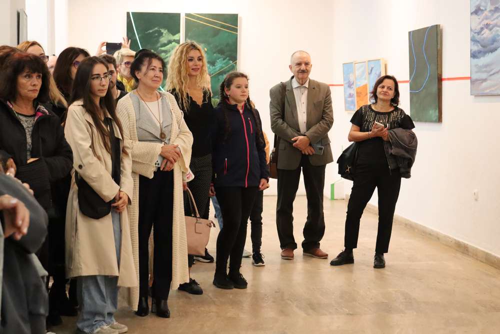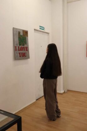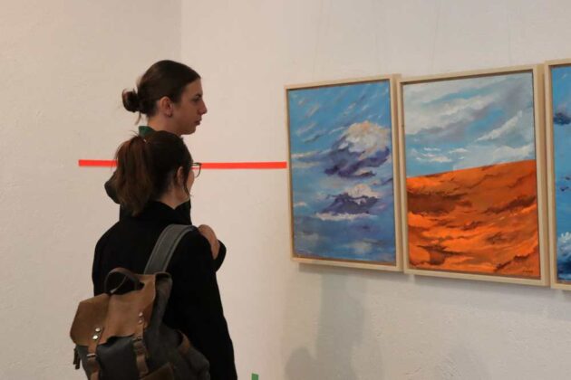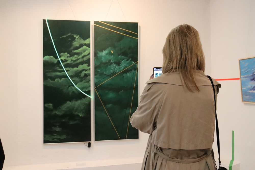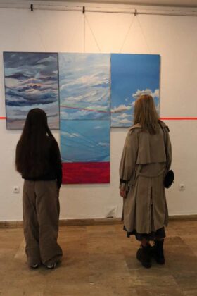 Plimbându-mă printre lucrările aflate pe simeze, am observat că acestea reprezintă, aproape toate, un cadru ceresc, pe care erau trasate, însă, linii drepte colorate sau unele linii curbe, tablourile fiind ”legate” între ele de alte dungi colorate întinse pe suprafața galeriei,dând întregului șir de creații ideea de continuitate. “El vorbește despre cer și despre iubire”, a menționat Carmen Poenaru, în cuvântul său, fapt care nu este foarte evident, în contextul expoziției, pentru un ochi mai puțin antrenat în ceea ce înseamnă artele. Dar, observând – subtil, dar totuși atât de evident – au apărut în planul meu iubirea și alte teme impozante ce pot să difere, din perspectiva fiecărei persoane.