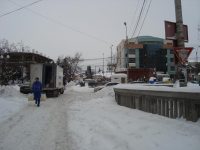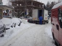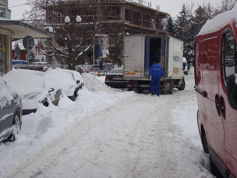 Oamenii lasasera masina cu marfa, undeva langa sediul Starii Civile si carau produsele cu spatele, pentru a nu ramane blocati cu autoutilitara, in zapada framantata. La cativa metri, in spatele magazinului „Profi”, soferul unei alte firme de distributie cauta disperat solutii sa scoata din zapada duba incarcata cu produse din carne.
