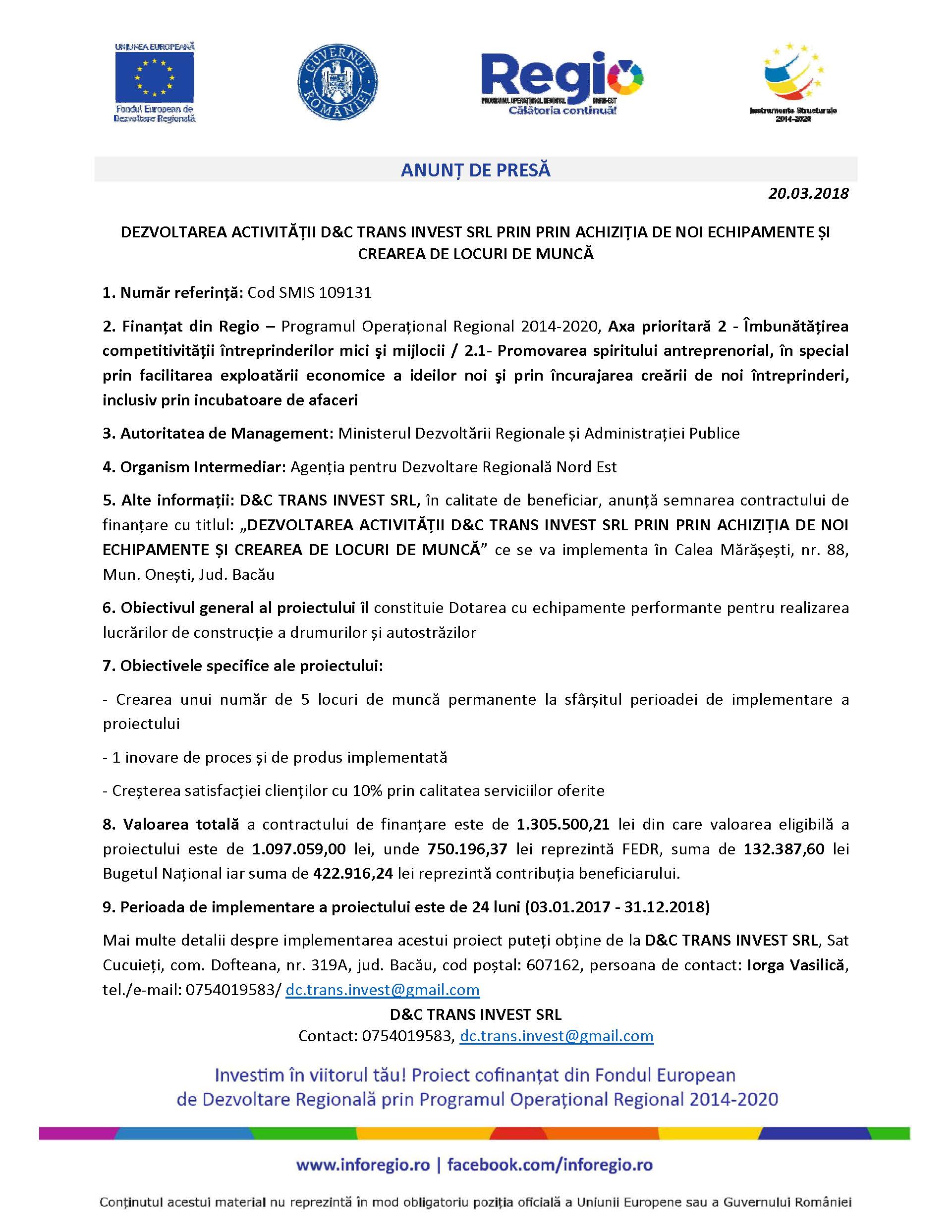Comunicat de presăDiversificarea activității D&C TRANS srl prin achiziția de noi echipamente și crearea de locuri de muncăde Comunicat de presa - 19 martie 2018AcțiuneFacebookTwitterWhatsAppTelegramVK