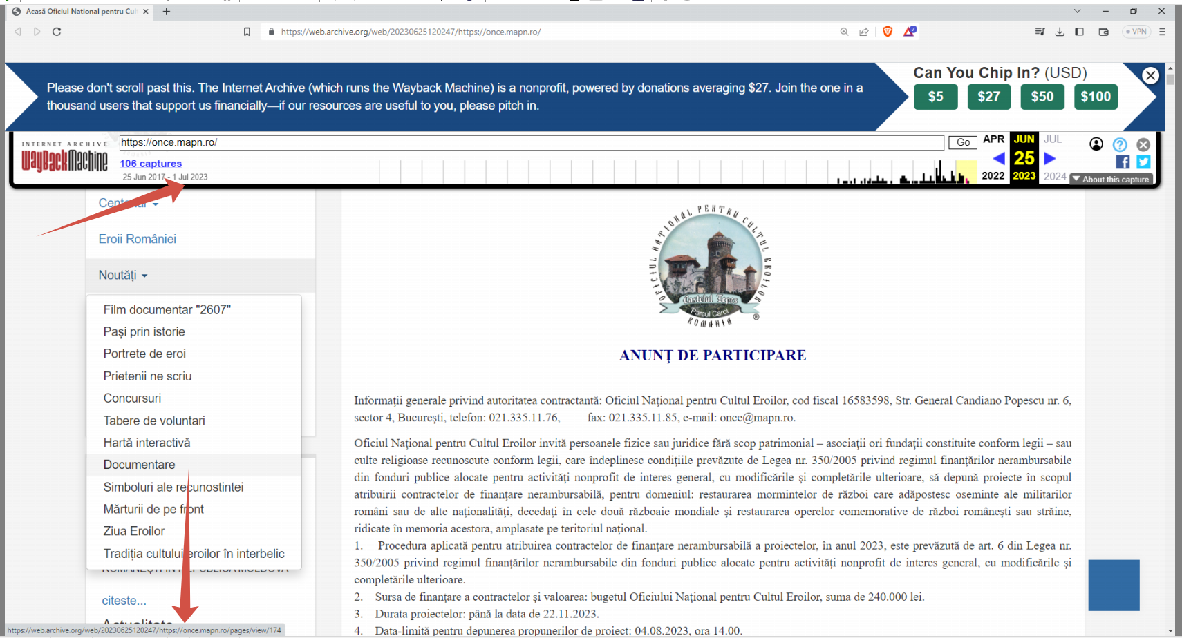 5. „Fotografia” de pe Archive.org din data de 1 iulie 2023 arată că linkul „Documentare” ducea la o adresă creată după vechea structura a site-ului (https://once.mapn.ro/pages/view/174) și nu la https://once.mapn.ro/pages/documentare, adresă care a apărut peste noapte.