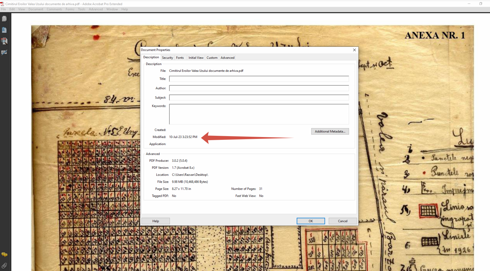 3. Documentul PDF reîncărcat nu are nici un fel de metadate în afara de una singură: data unei modificări realizate în data de 10 iulie ora 3.23.53 PM. Anexele din vechiul documentar, tot PDF, aveau metadate cu momentul în care au fost create: 6/12/19, ora 9.45.03.