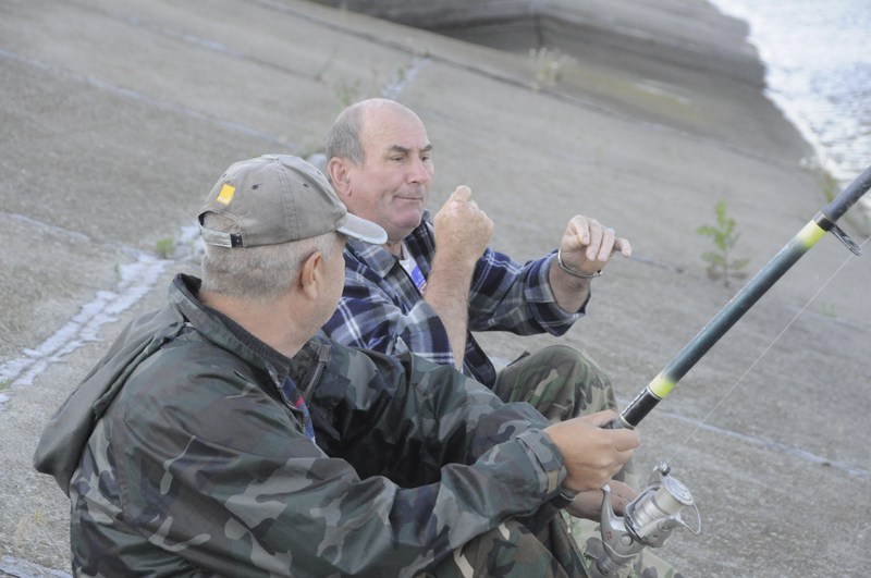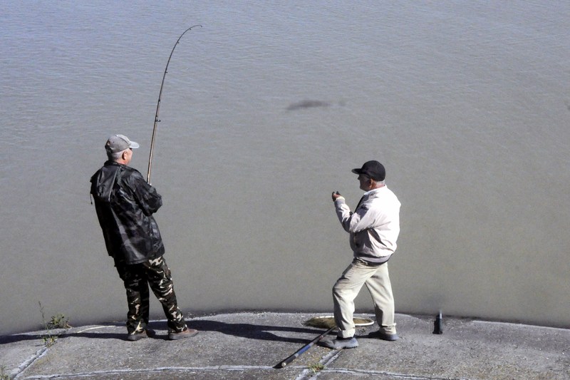 Nu cred ca atipisem de zece minute ca aud: „Da, am! Vin acuma!” Ma ridic buimac. „Au prins unul mare! Ma duc sa le duc minciogul”. Il strigase cel de la piciorul podului. Pun si eu teleobiectivul la aparat ca sa nu mai bat atâta drum. Plus ca de unde privesc, unghiul e mai bun. Ajunge in pas alert! Ala de-a strigat o tinea tot intr-un dril. Se apleaca, da sa-i intinda minciocul desfacut, ramâne cu ultimul tronson in mâna. Il impinge la loc. Omul se chinuie sa traga pestele spre el.