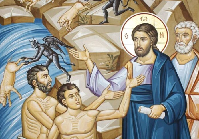 Este încurajatoare imaginea Evangheliei de astăzi. Domnul nu ezită a intra în coliziune cu demonii și ne arată că nu trebuie să existe complacere. Nimic din ceea ce ne propune acela – moarte trupească ori sufletească – nu poate fi confundat cu viața. Pentru că Hristos este Viața. Dușmanul este biruit, dar oamenii, dușmănind parcă pe Dumnezeu, sunt supărați de pierderea porcilor. Lumea de atunci, lumea de acum…