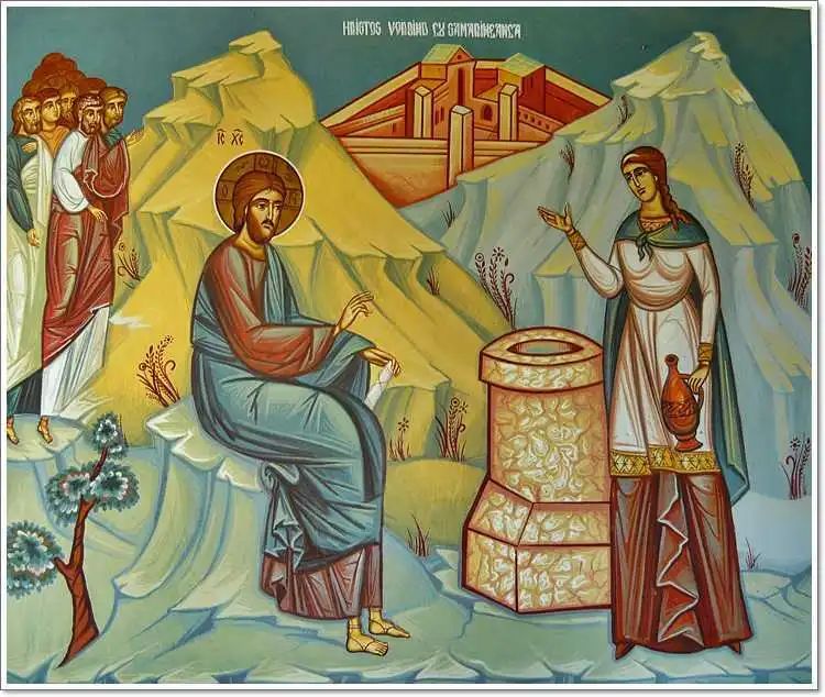 Suntem împreună călători cu Apostolii într-un tablou evanghelic ce ne așterne dinainte taifasul Dumnezeului celui Viu cu o persoană remarcabilă, samarineancă de neam. O femeie nerespectată de elita duhovnicească a Israelului, deci respinsă de societatea iudaică, pentru vina de a se fi născut într-o comunitate disprețuită, datorită amestecului de sânge și de mentalitate cu alte popoare decât cel ales. O femeie așezată, prin evanghelia de astăzi, în rândul mironosițelor. Asemeni celor ce înfruntă zorii Învierii, ceva mai târziu, ea pornește prin a se încuraja să-L înfrunte pe Necunoscutul care ședea la fântână. Este obișnuită să supraviețuiască contactului cu bărbații și nu este străină de cultura credinței. Cunoaște diferența dintre Templu și Lege. Se dovedește a fi o așteptătoare a Mântuitorului și este dispusă a deveni izvor de Har. Inteligentă și sinceră în căutare, înțelege faptul că nu este provocată de către Domnul a căuta o apă oarecare, ci apa cea vie… O probă de foc, dinaintea căreia samarineanca știe să riposteze admirabil. Identifică clar sursa și resursa: pe Hristos cu Dumnezeu. Acest dialog îi restartează viața. Din femeia cu cinci bărbați (niciunul al ei), devine femeia cu Un Singur Dumnezeu. Al ei! Căruia îi devine apostol. Și duce istoria neamului său spre Înălțare și spre cuprinderea omeniei din Hristos.