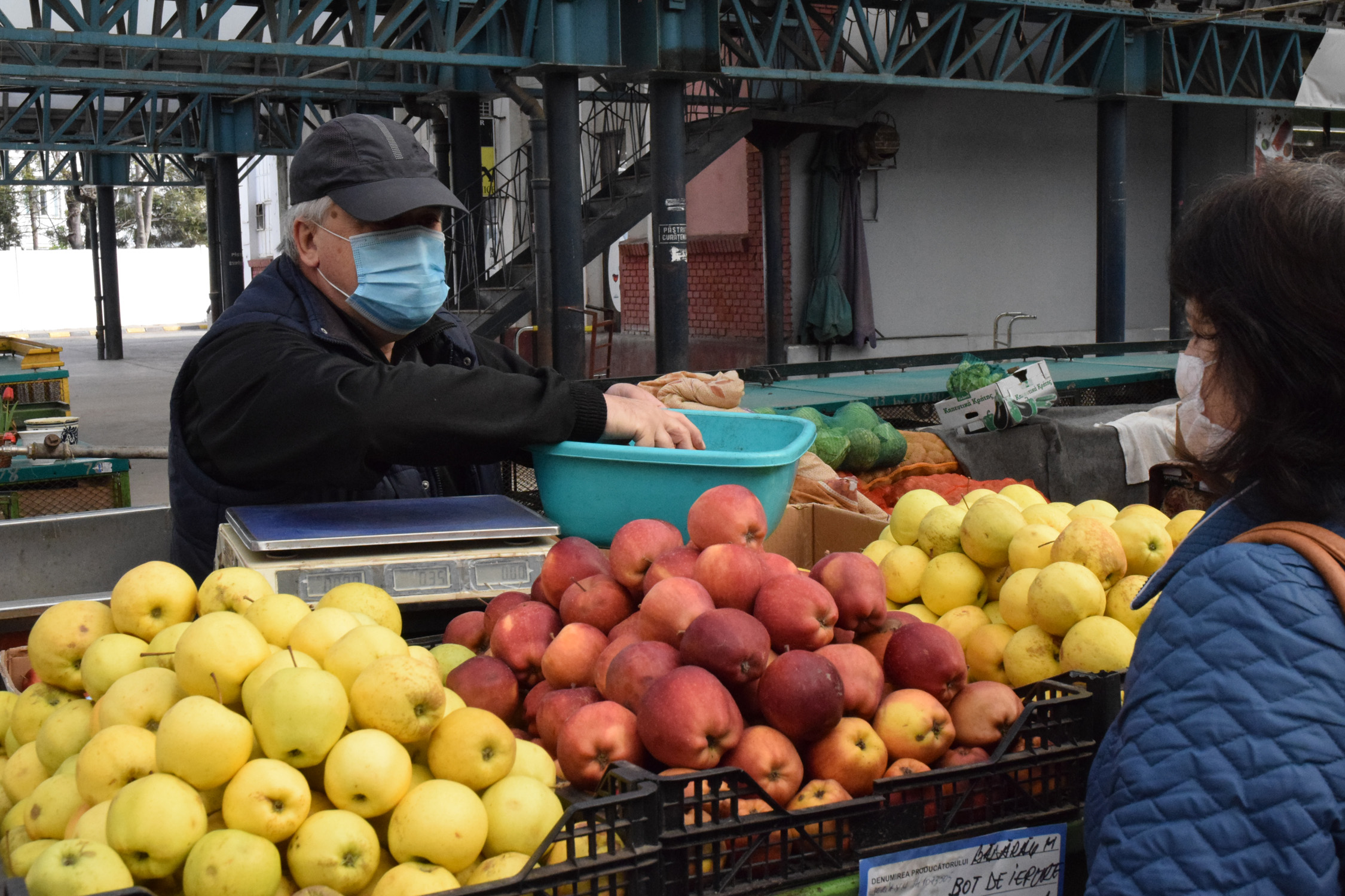 La o altă tarabă, încărcată cu tot soiul de mere, un alt domn cu ghiocei la tâmple. De loc din Panciu, Mihai Bădărău s-a mutat în Bacău. Vinde fructele produse în pomii pe care îi are acolo. „În piață lucrez de când am ieșit la pensie, în 2009. Am fost subinginer la Calea Ferată. Împlinesc 65 de ani în august. N-am mai trăit o perioadă așa de dificilă. Lucrez! Pentru că trebuie să te miști, să faci ceva, nu să lenevești. Am o fată care este în anul VI la Medicină, la Iași, și trebuie bani. Pensia ajunge pentru strictul necesar. Dar nu este vorba de asta. Îmi plac fructele și numai asta vând. Pentru că sunt culese de mine și le știu gustul, clientul revine mulțumit. Germanul ce spune: dacă mărul face vierme, înseamnă că dacă trăiește ăla, trăiesc și eu. Hai să facem un comerț civilizat, și pe sufletul omului.” Este zi de sărbătoare. Liniște. După mesele încărcate, puținii clienți caută tarabele cu verdețuri.