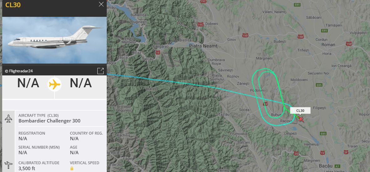 Un alt avion, un Bombardier Challager 300, avion privat, care vine de la Pisa, se învârte deasupra Buhușiului așteptând să poata ateriza.