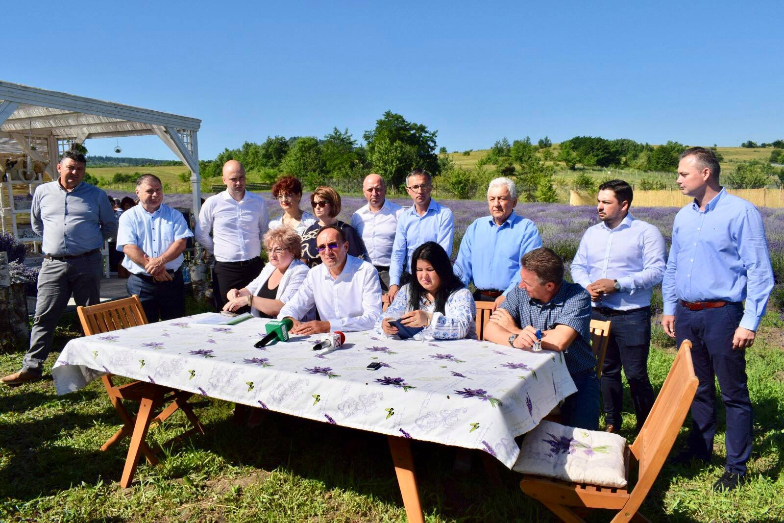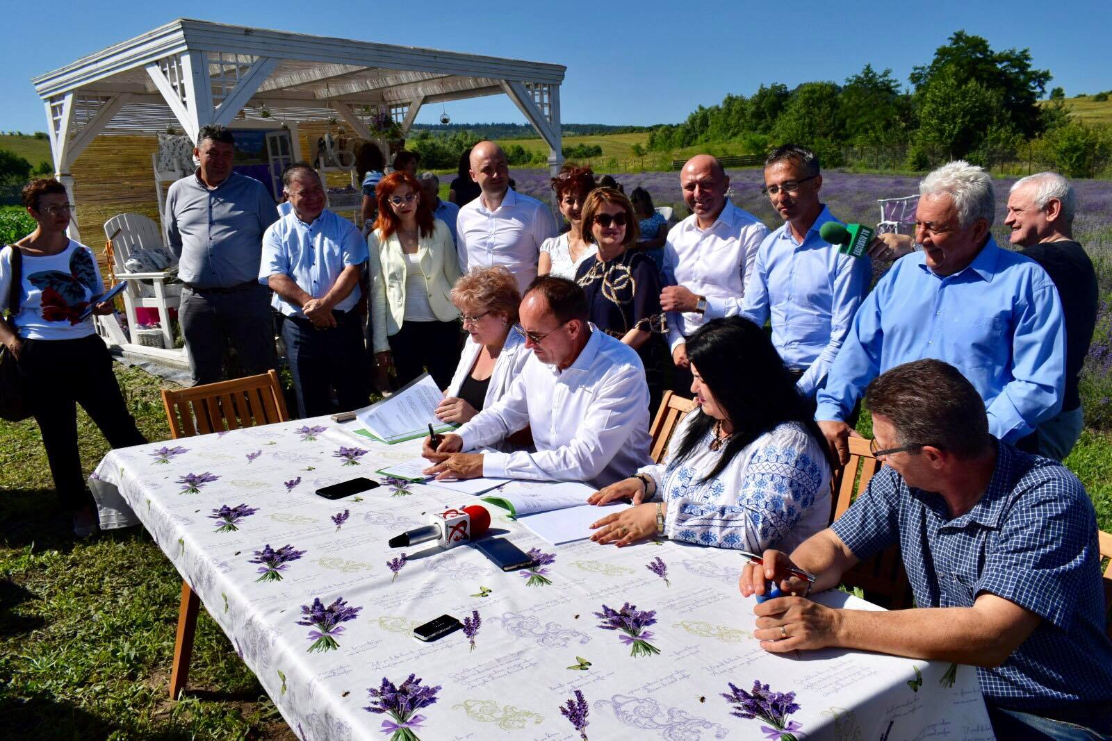 În câmpul cu lavandă din Poduri, pe o masă așezată sub cerul liber a fost semnat contractul de proiectare și execuție pentru modernizarea drumului județean (DJ) 117.