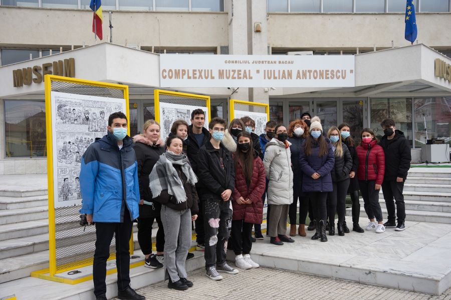 Vernisajul expoziției de bandă desenată „Povestiri din Holocaust. Bacău”, care cuprinde opt panouri, șase realizate de cercetătorii Institutului Național pentru Studierea Holocaustului din România „Elie Wiesel”, iar două de 15 liceeni băcăuani, selectați pentru a participa la proiect, a avut loc în data de 03 decembrie 2021. Ea este panotată pe esplanada din fața Complexului Muzeal „Iulian Antonescu” din Bacău și va putea fi vizionată până pe 3 ianuarie 2022. Din cele opt panouri, unul este generic, având ca tematică istoria Holocaustului din România, iar șapte acoperă povestea din Bacău. Prin intermediul artei, proiectul ne aduce mai aproape de istoria comunităților în care locuim, încurajându-ne să o descoperim și să o înțelegem.