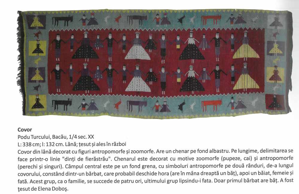 L-am identificat în desenul unui covor ţărănesc (reprodus în imaginea alăturată), aflat în Expoziţia de Artă Populară „Preot Vasile Heisu” din Răcăciuni. Noi l-am preluat din catalogul Expoziţiei, realizat de etnografii de la Complexul Muzeal „Iulian Antonescu” Bacău în 2022. Este un produs din lână, ţesut şi ales în război de Elena Doboş (din Podu Turcului), ornamentat cu figuri din lumea umană (perechi, dar şi oameni singuri) şi din cea animală (cai şi pupeze). Este figurată o scenă de dans popular (hora), pe două paliere identice. Liderul, pe care l-am asemui cu Dragobetele, instrumentează dansul, dirijându-l cu un băţ special. Alături îi stau un băiat, o femeie şi o fată, grup „familial” care se succedă în patru imagini identice (din ultimul grup este absentă fata).