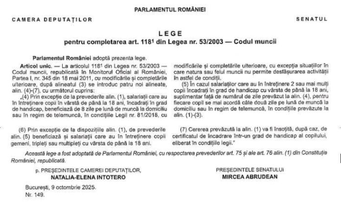 Practic, părinții unui copil cu handicap sub 18 ani au dreptul să lucreze 8 zile pe lună de acasă, fie prin telemuncă, fie direct de la domiciliu. Dacă în familie există doi sau mai mulți copii cu handicap, dreptul se extinde – fiecare copil în plus aduce încă 2 zile. Aceeași regulă se aplică și părinților cu gemeni, tripleți sau multipli.