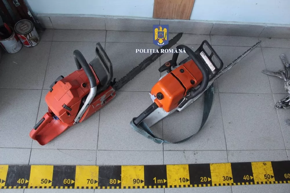 Drujbe, lanțuri și material lemnos ridicate în vederea confiscării, în urma unor percheziții domiciliare