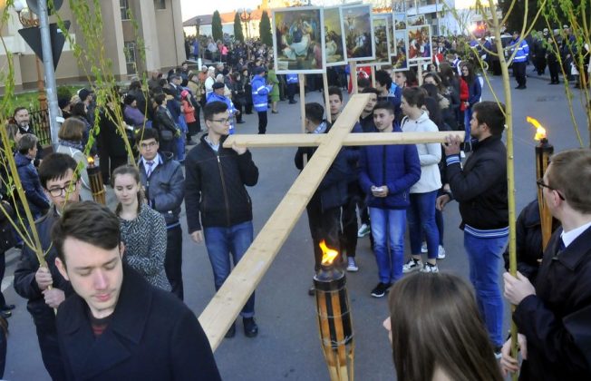 O dată cu Sărbătoarea Intrării Domnului în Ierusalim se încheie o primă etapă a Postului Mare. Încă din după-amiaza Duminicii Floriilor, atât credincioşii catolici, cât şi cei ortodocşi devin părtaşi la o perioadă intensă din punct de vedere liturgic. Astfel, creştinii romano-catolici băcăuani au putut participa la Calea Crucii, o procesiune care rememorează patimile Mântuitorului în drumul Său spre Golgota. Pe toată perioada Săptămânii Mari, bisericile romano-catolice desfăşoară un program intens de spovadă, astfel ca toţi credincioşii să poată primi sărbătoarea Învierii Domnului cu sufletele curate. În Joia Sfântă, de la ora 18.00, începe Triduumul pascal care debutează cu celebrarea Cinei Domnului. Momentele fundamentale ale acestei celebrări sunt: liturgia cuvântului, ritul spălării picioarelor, liturgia euharistică, mutarea Sfântului Sacrament. După ce are loc liturgia euharistică, la sfârşitul Liturghiei părintele mută Preasfântul Sacrament într-un loc special amenajat pentru a putea fi adorat. În Vinerea Sfântă, de la aceeaşi oră, vor fi celebrate Patima şi Moartea pe cruce a Domnului. Ieşind la altar, preoţii se prosternă cu faţa la pământ, după care are loc proclamarea lecturilor în care se face referire la suferinţa lui Cristos. Apoi are loc cântarea Patimii Domnului după Evanghelistul Ioan pe roluri. Urmează dezvelirea şi adorarea lui Hristos răstignit pe cruce. În Sâmbăta Sfântă, nu există nici o celebrare liturgică în cursul zilei. Vigilia pascală are loc sâmbătă la ora 21.00. Ea este compusă din patru părţi. Prima parte a celebrării va începe la intrarea în biserică cu binecuvântarea focului, pregătirea lumânării pascale, procesiunea de intrare în biserică şi proclamarea solemnă a Învierii. În a doua parte are loc Liturgia cuvântului, al cărei moment culminant este cel al intonării cântecului “Mărire în cer lui Dumnezeu (Gloria)”. În a treia parte are loc Liturgia baptismală, apoi va avea loc binecuvântarea apei pentru botez şi reînnoirea promisiunilor de la botez, iar partea a patra este Liturgia euharistică în care se vor împărtăşi credincioşii. După sfânta Liturghie din noaptea Învierii Domnului, va avea loc o procesiune pe străzile Bacăului ca mărturie de credinţă în Învierea lui Cristos.