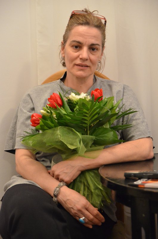 …Mi-ati facut o surpriza, va multumesc…sunt cele mai frumoase flori. Sa vorbim, mi-a spus domnul director Gazdaru ca vreti sa vorbim, dupa aceea, la treaba, ma duc pe scena, fac repetitii, ma pregatesc pentru spectacol.