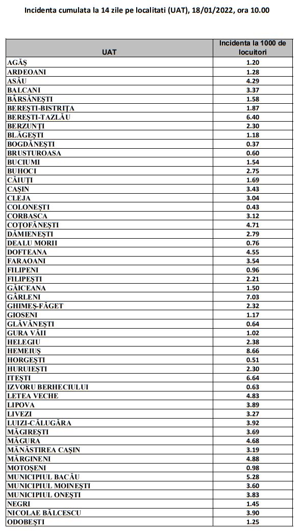 Conform DSP Bacău, rata de incidență cumulată la 14 zile a ajuns, la nivelul județului, la 3,61 la mie.
