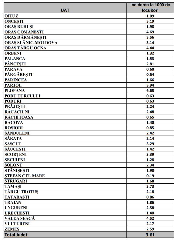 În municipiul Bacău, rata de incidență a ajuns la 5,28 la mie, la Onești – 3,83 iar la Moinești – 3,60.