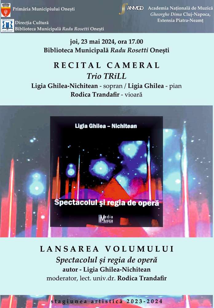 Biblioteca Municipală „Radu Rosetti” din Onești, în colaborare cu Primăria Municipiului Onești și Academia Națională de Muzică Gheorghe Dima Cluj-Napoca, Extensia Piatra-Neamț, organizează un eveniment deosebit în cadrul stagiunii muzicale 2023-2024. Joi, 23 mai 2024, publicul este invitat la un dublu eveniment cultural ce include lansarea de carte și un recital cameral.