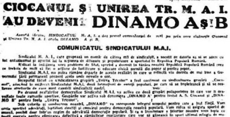 La începutul lui 1948, sub tutela Ministerului de Interne a mai trecut o prim-divizionară, Ciocanul. Iar pe 11 aprilie, ziarul „Sportul Popular” publica un comunicat elaborat de Sindicatul Ministerului Afacerilor Interne: „Pe drumul realizărilor democratice Sindicatul MAI va activa cu două grupări polisportive în care vor fi desvoltate toate ramurile sportive. Grupările vor acționa sub denumirea «Dinamo A» pentru fostul AS Ciocanul și «Dinamo B» pentru fosta Unirea Tricolor”. Dinamo B, adică fosta Unirea Tricolor a retrogradat în B la finalul sezonului 1947-’48, dupa un „baraj” cu AS Armata București, viitoarea…Steaua! Un an mai târziu, Dinamo B termina pe loc de promovare campionatul diviziei secunde. În locul său, însă, promova Metalochimic Reșița. Motivul? În Divizia A nu era loc și pentru… Dinamo B.