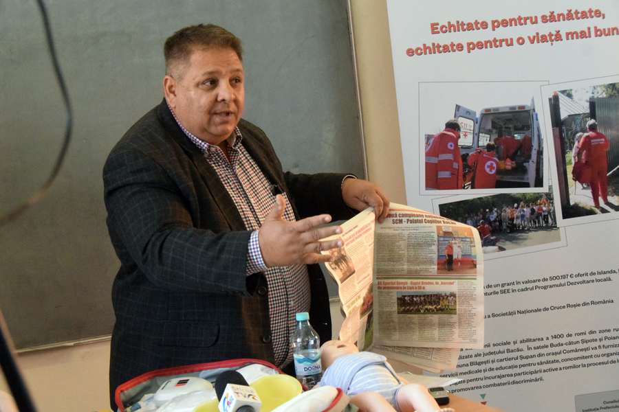 Dan Marcel Babliuc, director Crucea Roșie Bacău: „Noi avem săptămânal activități conform programului depus și finanțat. Următorul pas va fi la Comănești, Șupan. Vedeți! Oamenii, copiii se bucură. Nu venim cu mâna goală. Trebuie să-i motivăm să vină la școală. Ei când ne văd știu că primesc ceva. Vedeți ce bază sportivă au aici? Noi ne încărcăm de multe ori negativ când vedem cum trăiesc. Ce condiții de trai au. Imaginile acelea rămân pe retină. Sinapse. Oftezi! Îi ajutăm. Mă bucur că avem tineri care vin să facă voluntariat, și acele puncte pentru prezență și seriozitate pe care le putem da, le vor fi de folos pentru viitor. Majoritatea vor să urmeze o carieră în medicină. Mă bucur că se vede! Se face ceva.”