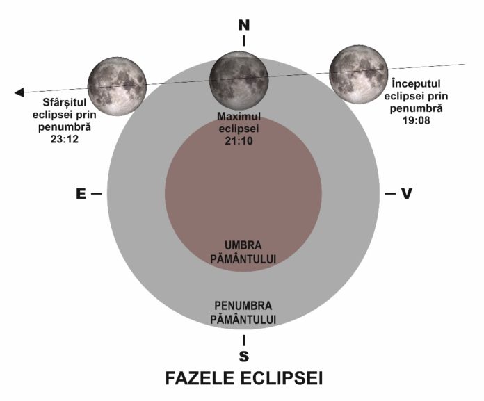 Eclipsa de Lună prin penumbră va începe la ora 19.08, când Luna va începe să intre în conul de penumbră al Pământului, atingând maximul la ora 21:10, când aproximativ 90% din suprafaţa Lunii va fi acoperită de penumbra Pământului. Eclipsa se va termina la ora 23:12, moment în care Luna va ieşi din penumbra Pământului.