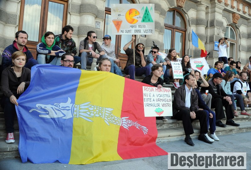 La protestul de duminca trecuta, insa, in lipsa jandarmilor care sa le strice ploile, si mai ales bazându-se pe existenta unei autorizatii, protestatarii, fluturând un steag cu lupul geto-dacic, au prins curaj si au inceput sa fluiere, sa scandeze diverse sloganuri indreptate impotriva celor care sustin continuarea proiectului de la Rosia Montana.