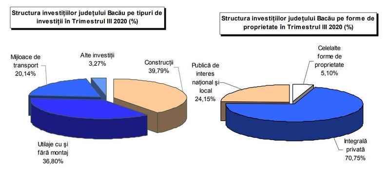 Pe primele 9 luni ale lui 2020, volumul total de investiții realizate de agenții economici din eșantionul Direcției Județene de Statistică a crescut cu 30 la sută, în general datorită firmelor cu capital privat. Aproape 45% din investiții au vizat construcțiile (în scădere, totuși cu 4%), aproape 35% utilajele (+2%) și 15% mijloacele de transport (-1%) față de perioada similară a anului 2019.