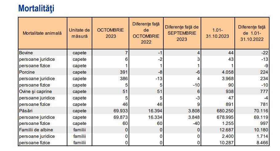 În ceea ce privește mortalitatea animală, există variații notabile față de aceeași perioadă a anului 2022 și a lunii septembrie 2023. Bovinele și porcinele au înregistrat o creștere a mortalității, în timp ce ovinele, caprinele și păsările au înregistrat diferențe semnificative.