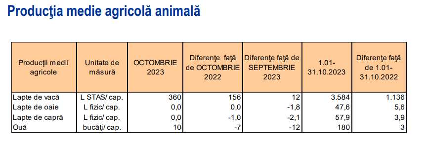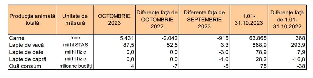 Producția de lapte: Producția de lapte de vacă a fost de 868,9 mii hectolitri, cu o creștere semnificativă față de octombrie 2022 și septembrie 2023. Producția medie pe cap de animal a înregistrat și ea o creștere considerabilă.