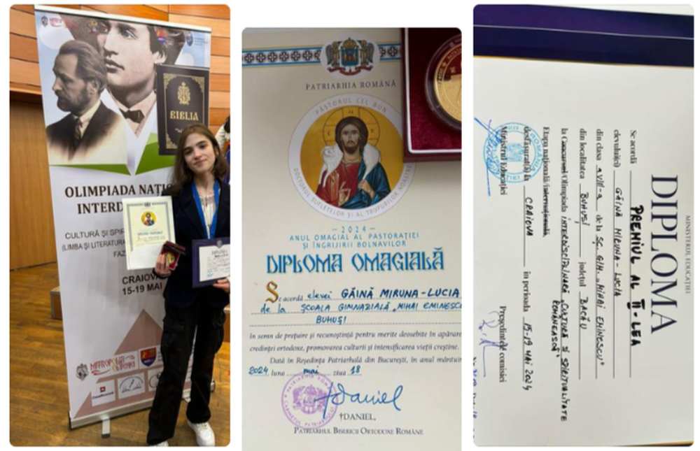 Școala Gimnazială ‘Mihai Eminescu’ din Buhuși a obținut o nouă performanță notabilă în domeniul educației. Eleva Găină Miruna-Lucia a câștigat Premiul al II-lea la faza națională a olimpiadei de Cultură și Spiritualitate Românească, desfășurată la Craiova în perioada 15-19 mai 2024.
