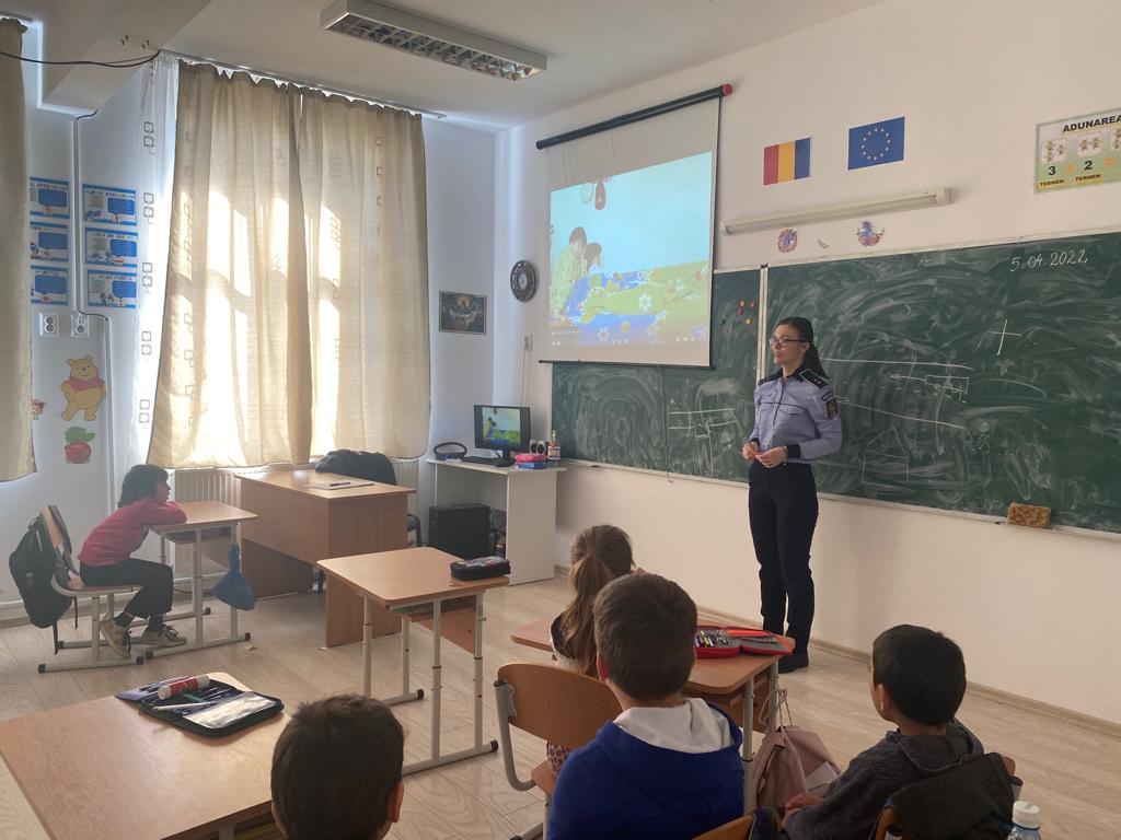 Elevii au vizionat filmulețe educativ-preventive menite să le dezvolte abilități de gestionare a riscurilor și au avut ocazia să adreseze întrebări despre meseria de polițist.