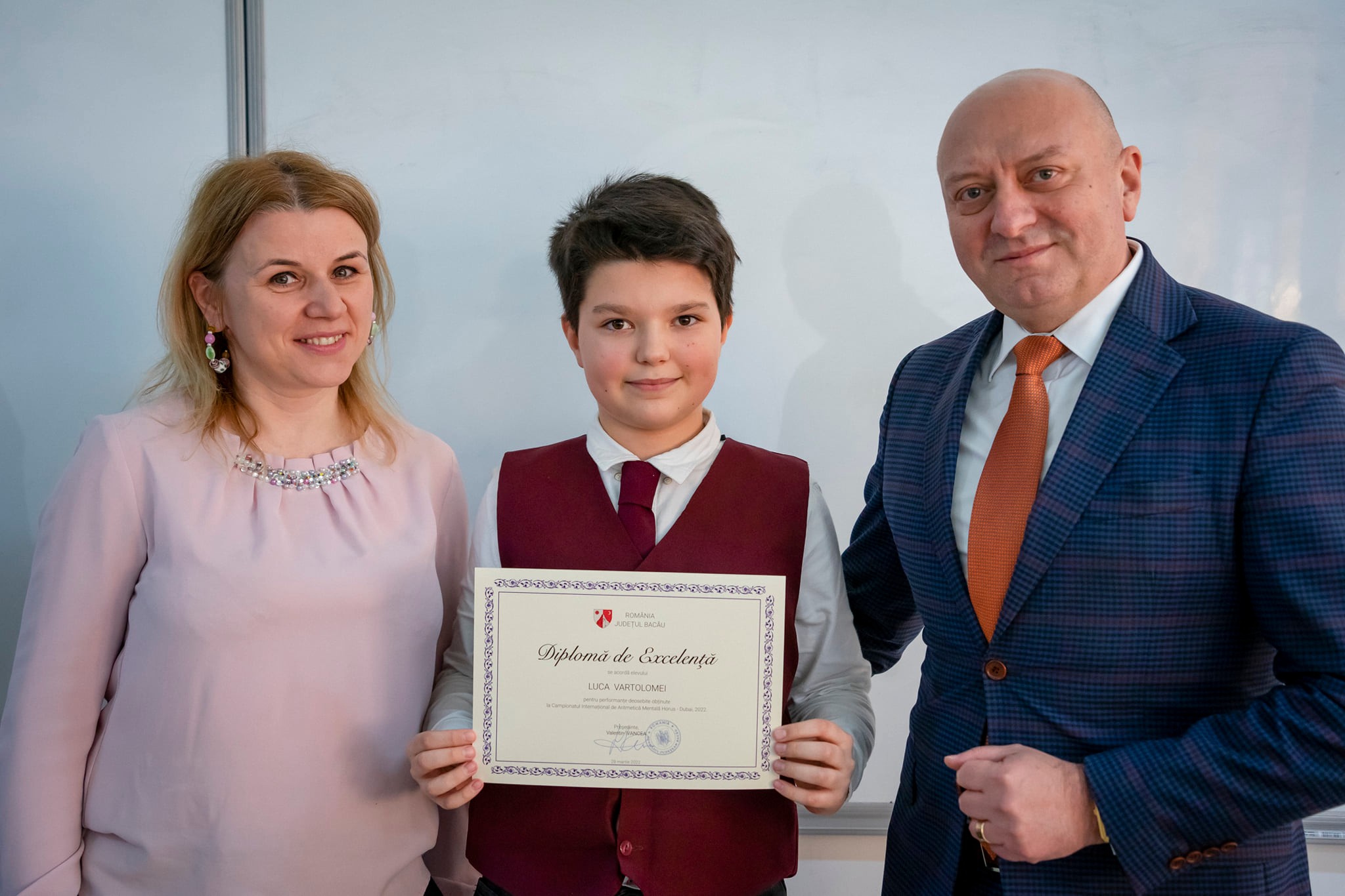 În cadrul ședinței CJ de astăzi, președintele Consiliului Județean Bacau a propus și, prin votul consilierilor județeni, s-a aprobat recompensarea elevului Luca Vartolomei pentru performanțele deosebite obținute la Olimpiada Internaţională de Aritmetică Mentală pentru copii Horus Dubai 2022.