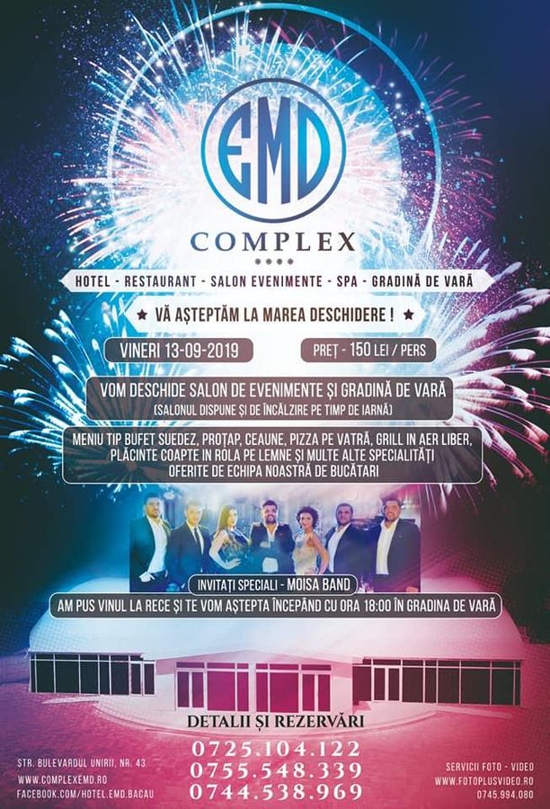 Revenind la eveniment, deschiderea celor două noi componente, Salonul de Evenimente și Grădina de Vară, trebuie spus că acesta va avea loc vinri, de la ora 18.00. Conducerea și personalul Complexului EMD îi așteaptă pe toți cei care își doresc o serată specială, oferindu-le cel mai bun cadru. Invitați speciali sunt Moisă Band care vor fi responsabili cu muzica și voia bună, la care se adaugă meniul de tip bufet suedez, proțap, preparate la ceaun, pizza pe vatră, grill în aer liber, plăcintă coaptă în rolă pe lemne și multe alte specialități.