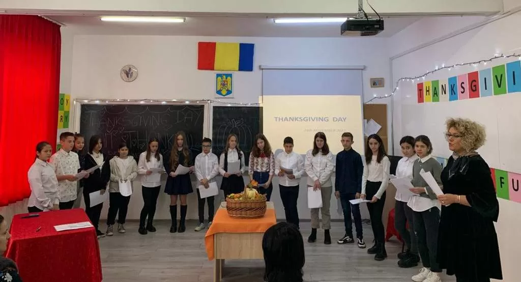 Sub directa îndrumare a doamnei diriginte, elevii clasei a VI-a A, au decorat clasa în spiritul sărbătorii care aduce cu sine și sfârșitul toamnei, cu ghirlande luminoase, frunze uscate, coș cu fructe de sezon, panouri cu citate și desene depre Ziua Recunoștinței, dar și prezentarea unui power- point cu semnificația acestei sărbători americane, printr-o incursiune în timp (Ce este Thanksgiving/ Ziua Recunoștinței? Unde și când este sărbătorită?, despre James I și decizia pelerinilor de a migra spre Nordul Americii, despre indienii Wampanoag și contribuția lor, despre ambarcațiunea Mayflower, prima iarnă pe tărâm străin, prima lor cină, drept recunoștință îndreptată divinității, dar și simboluri și citate semnificative pentru această sărbătoare). După expunerea bilingvă a materialului power-point în fața auditoriului, elevii au suținut un mini-recital cu poezii și cântece, în limbile engleză, italiană și franceză (Gratitude Song, Harvest Song, L’autunno, etc) pentru a marca sărbatoarea americană, dar și sfârșitul de toamnă.
