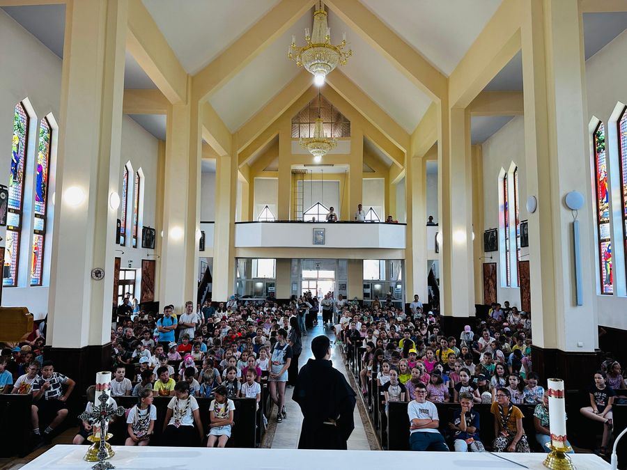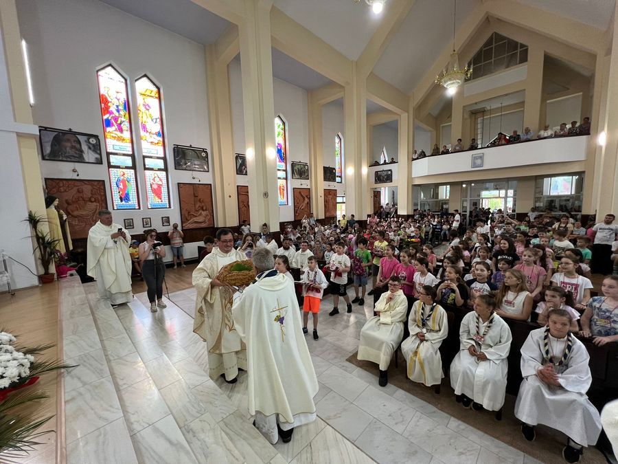 A urmat apoi un moment de pregătire pentru punctul central al zilei: Sfânta Liturghie, care a fost celebrată de părintele decan, Benone Lucaci, alături de preoții care i-au însoțit pe copii la această sărbătoare a bucuriei.