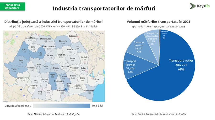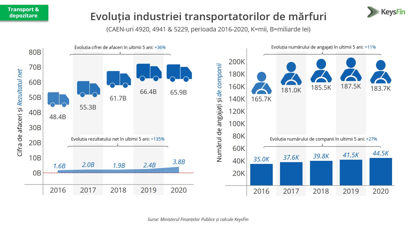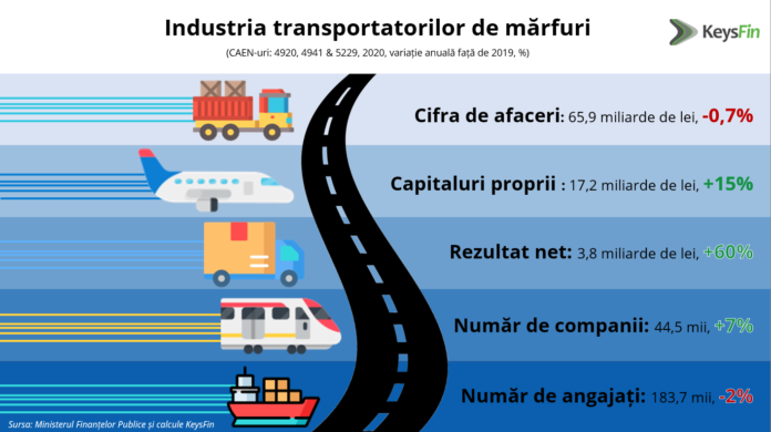 Notă: Notă: Analiza KeysFin are la bază datele financiare anuale, neajustate, agregate, raportate de companii la Ministerul Finanțelor (la sfârșitul perioadei) care au ca domeniu principal de activitate unul dintre următoarele coduri CAEN: 4920 – transporturi de marfă pe calea ferată, 4941 – transporturi rutiere de mărfuri sau 5229 – alte activități anexe transporturilor. Toate cifrele sunt exprimate în lei iar datele au fost extrase în aprilie 2022.