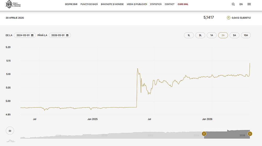 Datele oficiale ale Banca Națională a României indică o schimbare clară de regim în mai 2025. După o perioadă lungă de stabilitate relativă, în jurul valorii de 4,95–4,98 lei/euro, cursul a cunoscut o creștere bruscă, depășind pragul psihologic de 5 lei. Important este faptul că ulterior nu a revenit la nivelurile anterioare, ci s-a stabilizat într-un nou interval, cu o tendință lent ascendentă. Din această perspectivă, nivelul de 5,14 lei reprezintă mai degrabă o consolidare a unei noi realități decât o deviație excepțională.