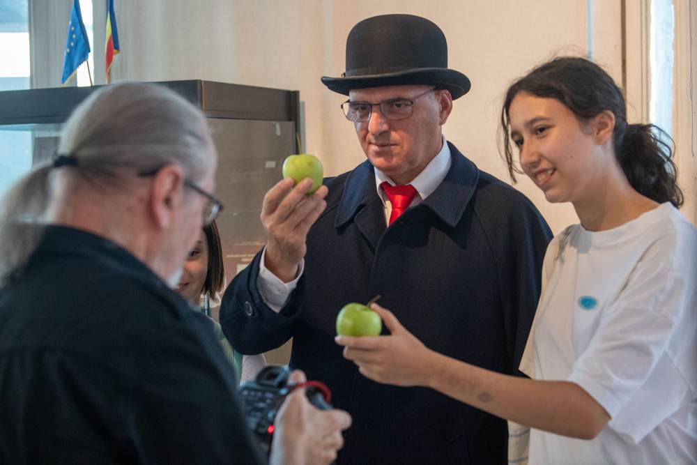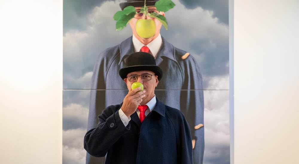 Spațiul de la Galeriile ALFA a fost prea mic pentru numărul celor care au vrut să participe la eveniment. Au fost întâmpinați de VEM, coborât parcă din fotografia care domină expoziția, îmbrăcat la fel ca mentorul lui, Rene Magritte, dintr-un celebru tablou. La intrare, un coș imens cu mere verzi. Toate aceste mici detalii, au avut importante semnificații în derularea evenimentului. Până și titlul expoziției face trimitere la Rene Magritte, care este autorul celebrei opere Ceci n‘est pas un pipe (Aceasta nu este o pipă): Ceci n‘est pas un Magritte (Acesta nu este un Magritte).