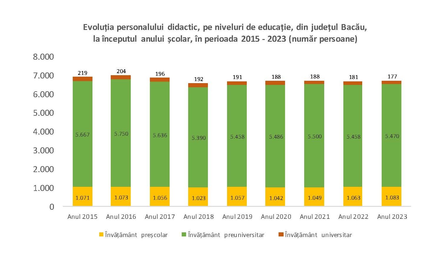 În județul Bacău, evoluția personalului didactic între anii 2015 și 2023 a înregistrat schimbări semnificative, mai ales în ceea ce privește numărul cadrelor didactice din învățământul preuniversitar. Datele evidențiază o tendință de scădere la acest nivel, în contrast cu ușoarele creșteri sau menținerea numărului de cadre în alte categorii de învățământ.