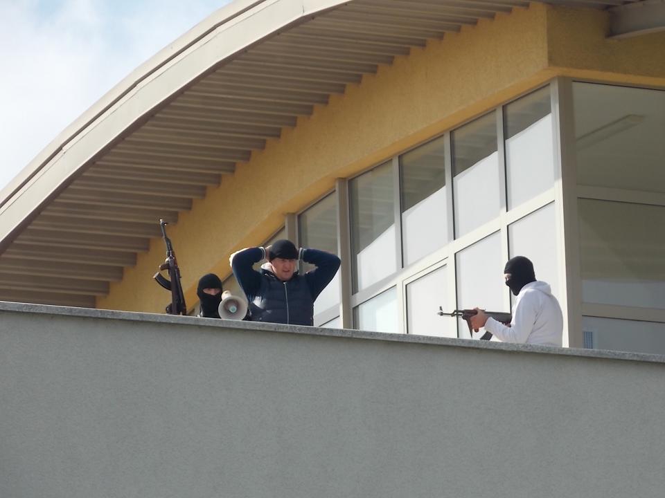 Doua persoane ostile au rapit un barbat si s-au refugiat apoi pe terasa unuia din complexele expozitionale, unde, sub amenintarea ca il vor omora pe civil au cerut o serie de revendicari.